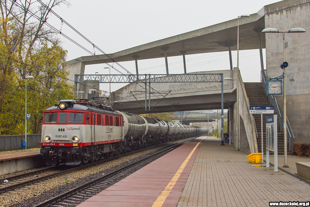 EU07-013 z Trainspeed ze składem beczek mija przystanek Wrocław Stadion