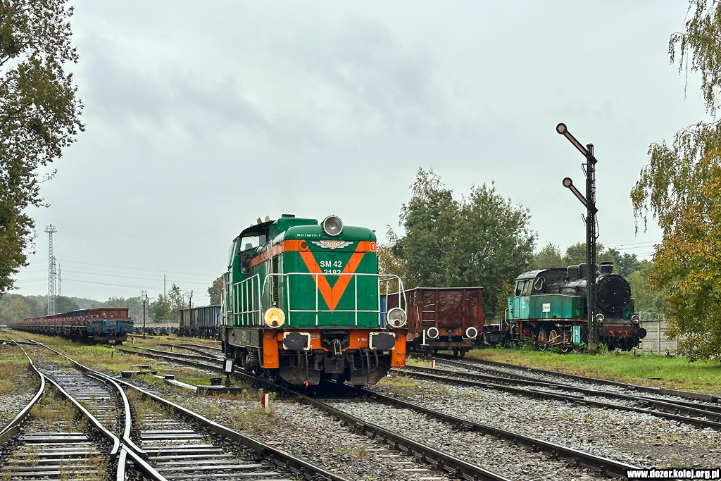 SM42-2182 manewruje na terenie zakładu ZEM Łabędy w Gliwicach, w oddali parowóz TKp 12800 - 06.10.2025.