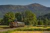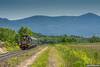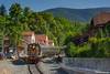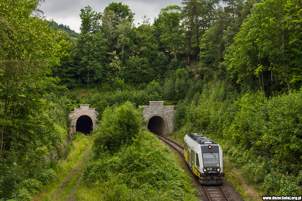 pociągiem z Jeleniej Góry do Karpacza wjeżdża do Miłkowa pozując na tle