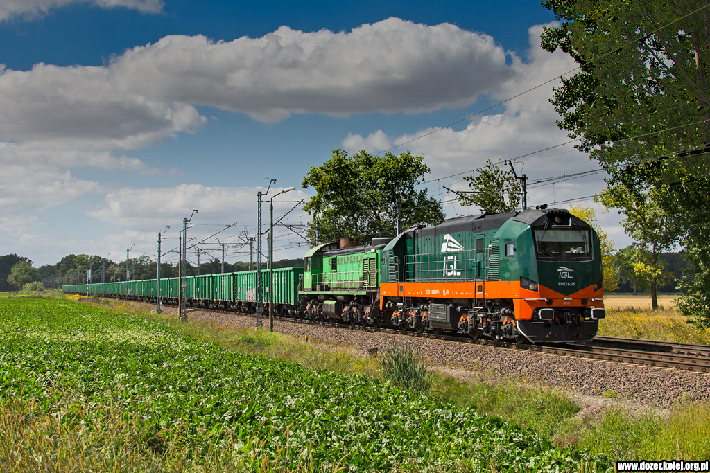 311D-16 z pociągiem towarowym IGLu do Jawora zbliżają się do Szczedrzykowic