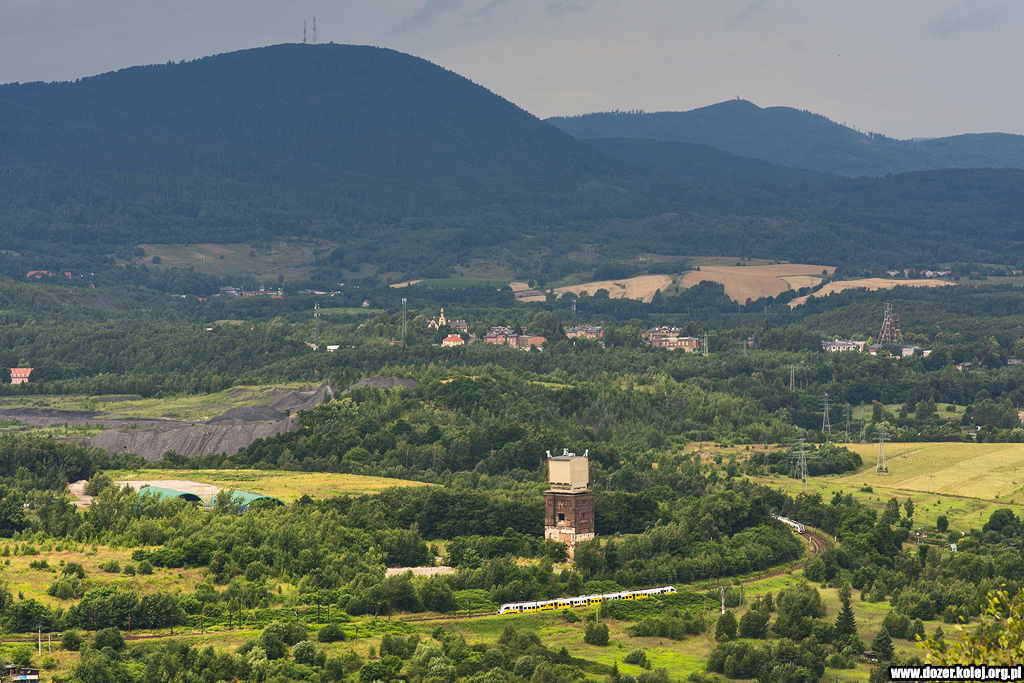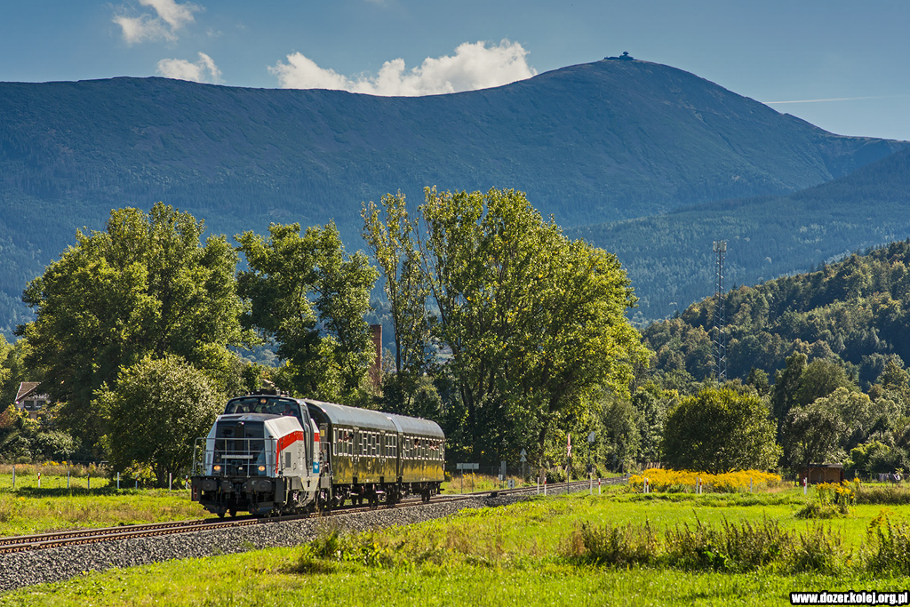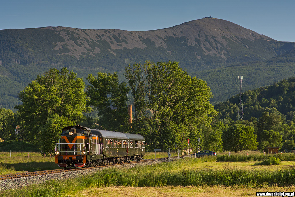 linii wjeżdża do Miłkowa, w tle Śnieżka