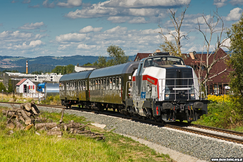 SA109-004 opuszczają Dzierżoniów podczas jazdy testowej po P5 jako pociąg z