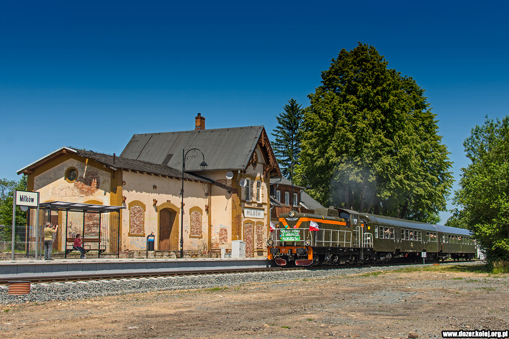 pociągiem specjalnym organizowanym przez KSK Wrocław mija przystanek Miłków