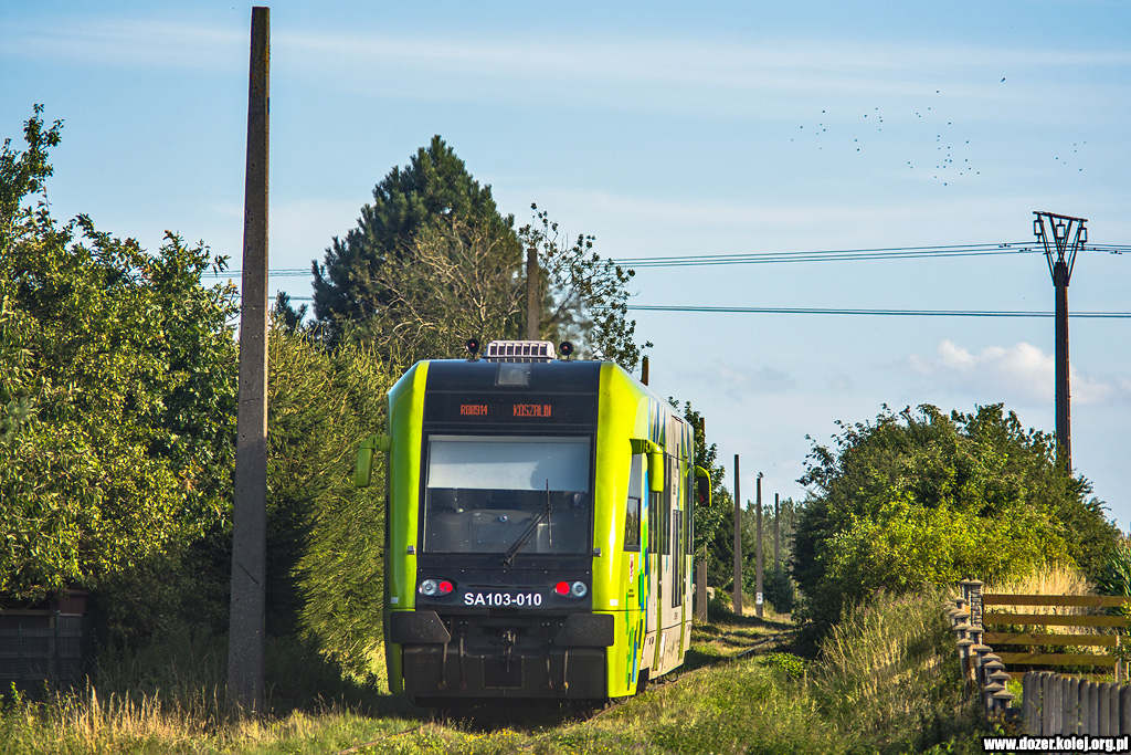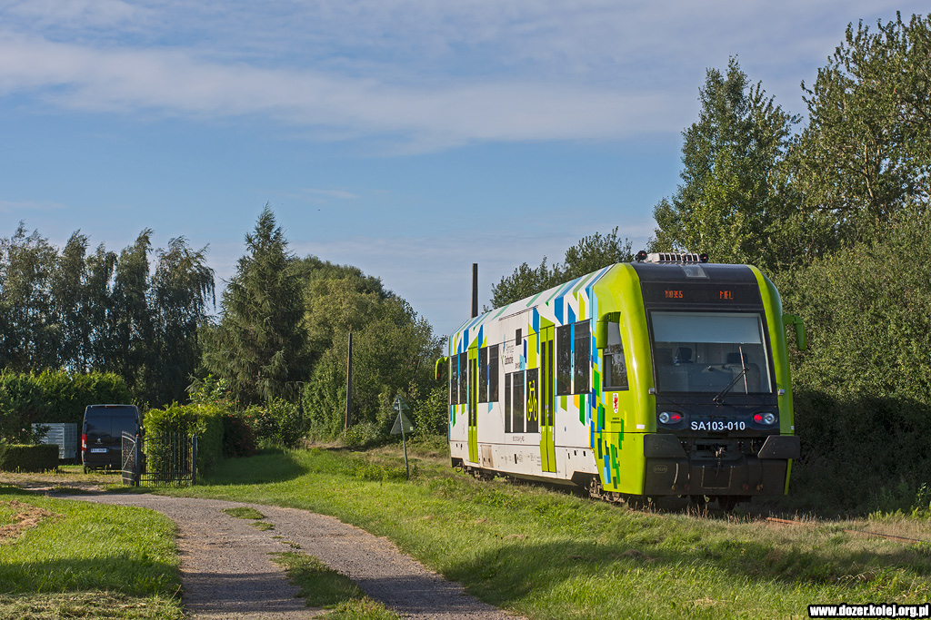 SA109-004 mijają przystanek Suszka podczas jazdy testowej po przeglądzie P5 - 02.06.2025. |